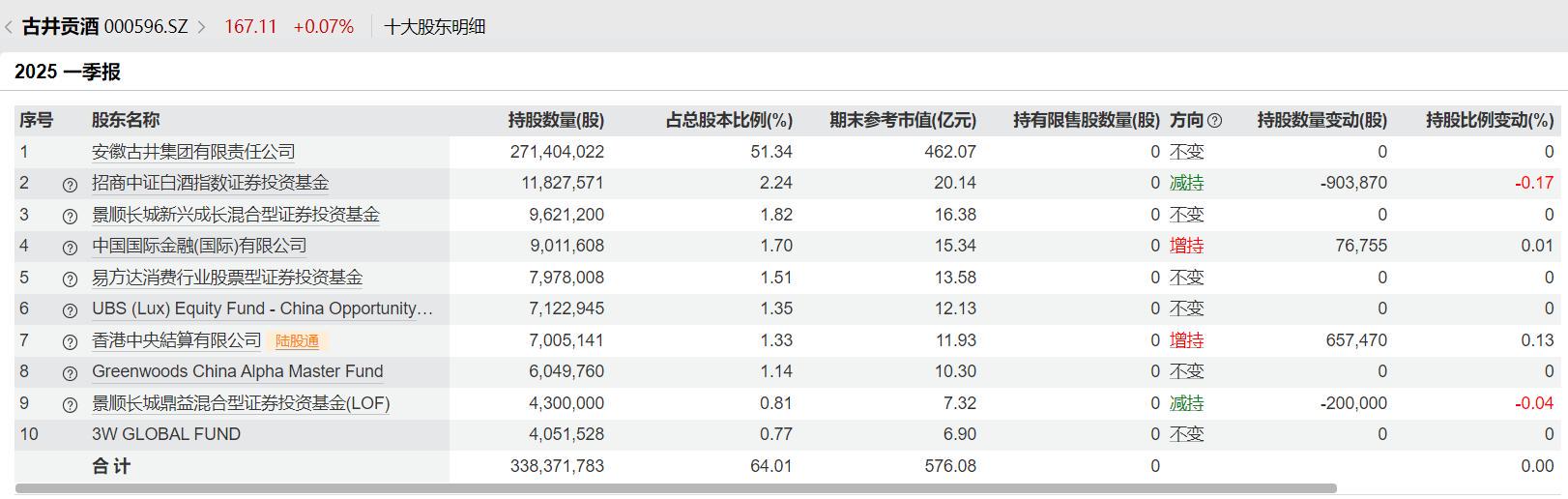 十大股东方面,2025年第一季度,中国国际金融(国际)有限公司、香港中央结算有限公司增持古井贡酒,招商中证白酒指数证券投资基金、景顺长城鼎益混合型证券投资基金(LOF)减持。