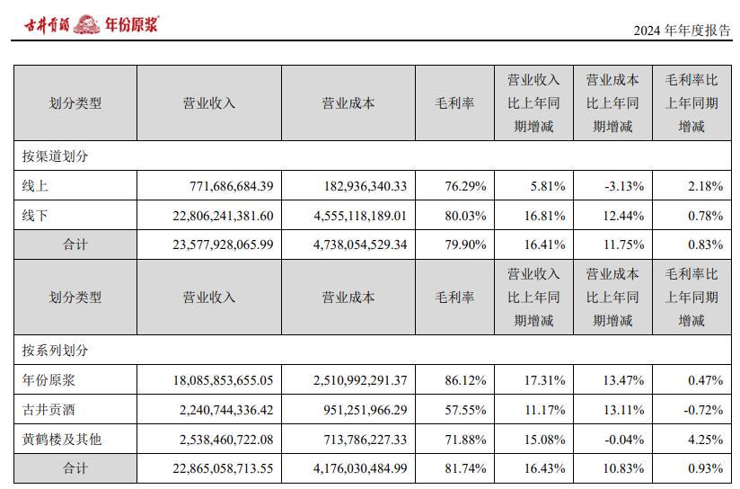 按渠道划分,古井贡酒2024年线上营业收入7.72亿元,同比增长5.81%;线上营业收入228.06亿元,同比增长16.81%。此外,线上、线上毛利率比上年同期分别增长2.18%、0.78%。