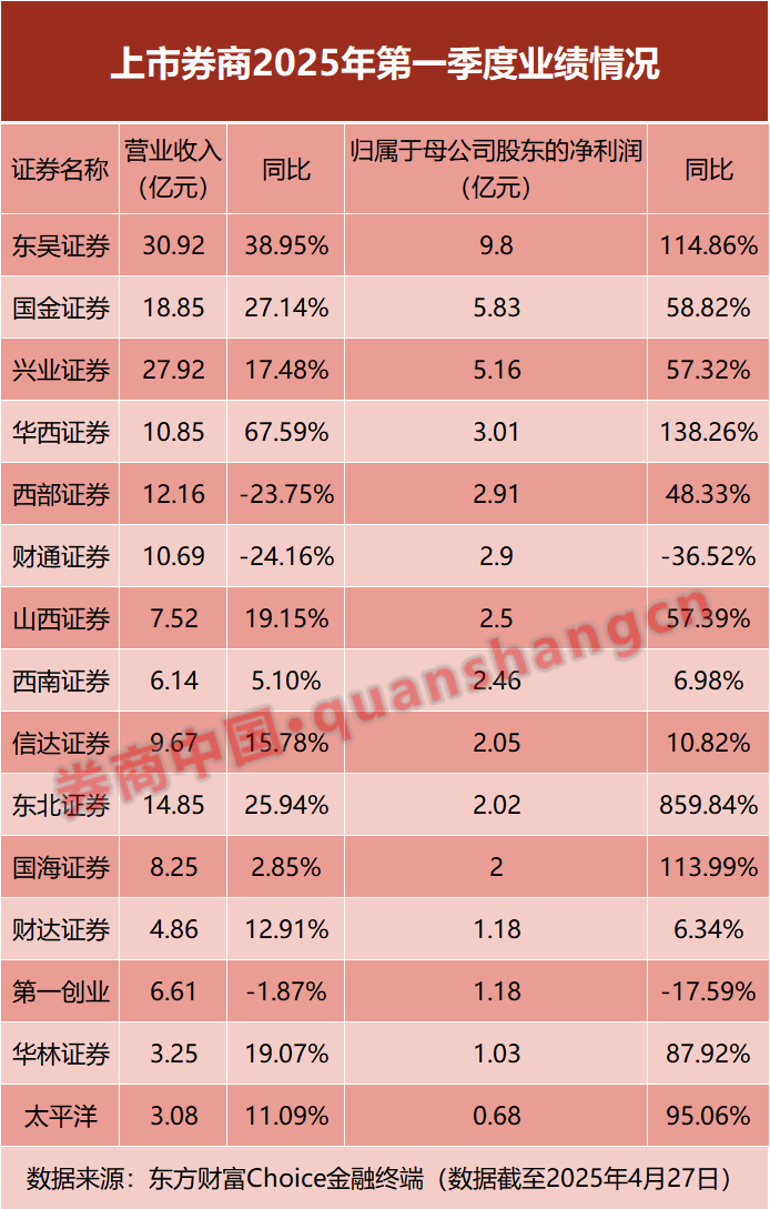 截至4月27日,共有15家上市券商披露2025年一季报,其中超八成券商净利润实现同比增长。其中,东吴证券、华西证券、东北证券、国海证券4家券商一季度净利润同比大增超100%。