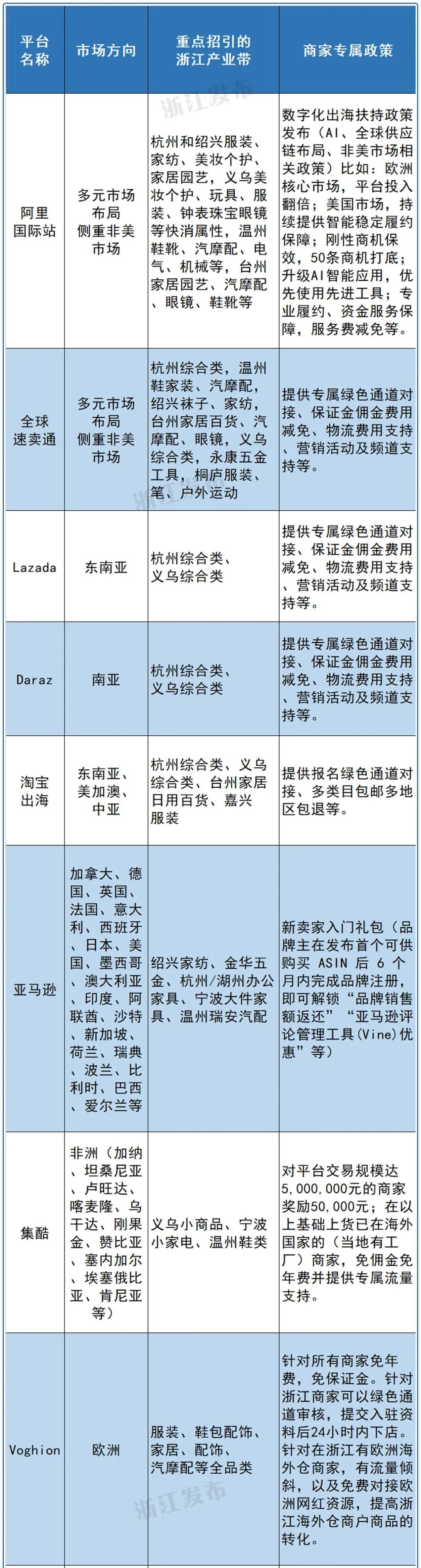 全球速卖通、Lazada、Daraz、淘宝出海、阿里国际站、亚马逊、集酷、Voghion、中国制造网、义采宝、Inniverse、毛衫派、得物、OTTO、日本乐天、新蛋、Shopee、wildberries、Egatee、Ozon Global等20家跨境电商平台当上了“超级联系人”,一头连接全球消费市场,一头连接绍兴家纺、金华五金、义乌小商品、湖州童装、宁波小家电、温州鞋类、嘉兴毛衫、衢州户外用品、丽水不锈钢、诸暨袜业等40多条产业带。