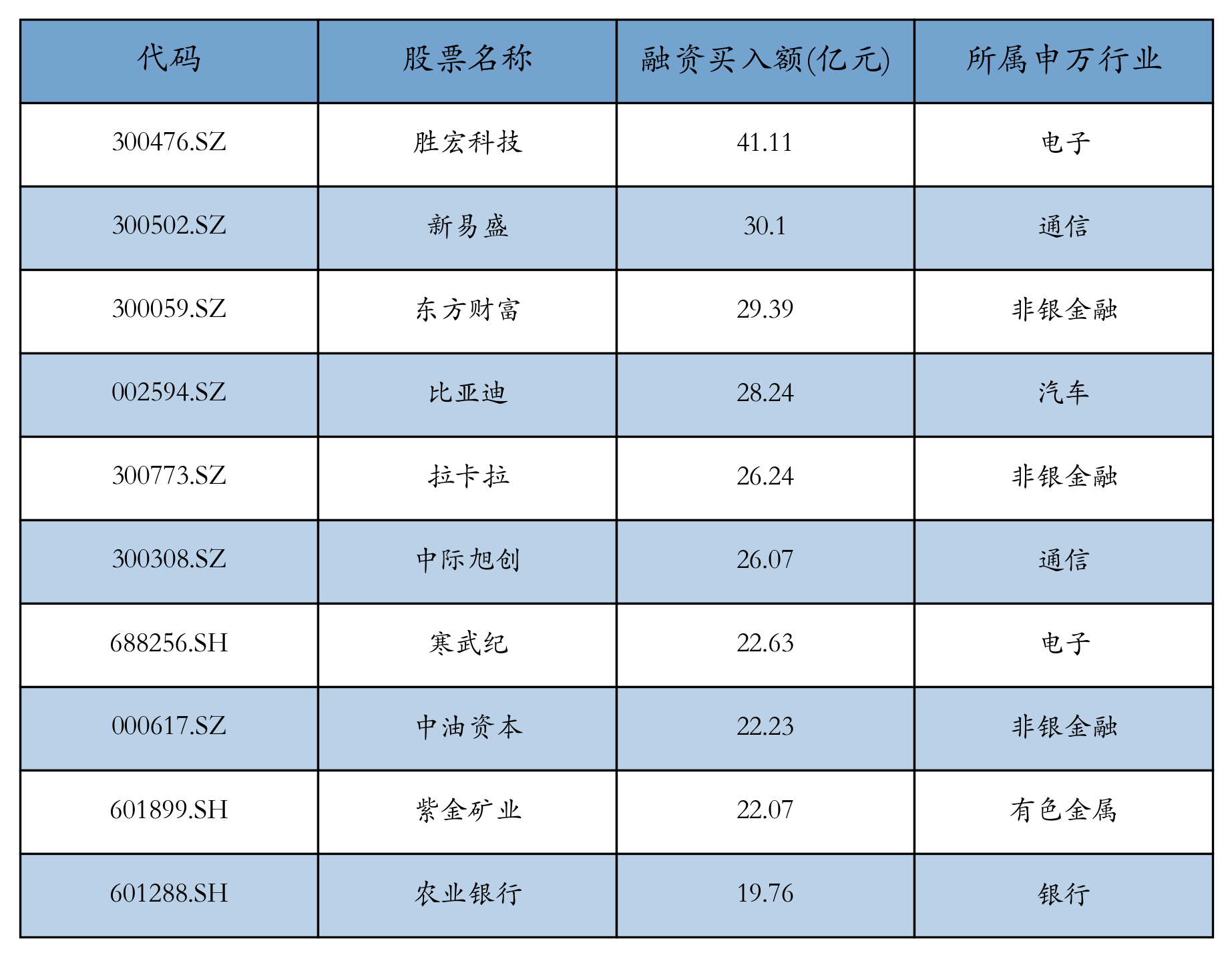 上周两市共有3428只个股有融资资金买入,共有35只个股买入金额超10亿元,其中胜宏科技、新易盛、东方财富排名前三,买入金额分别41.11亿元、30.1亿元、29.39亿元。融资买入额前10个股详情见下表: