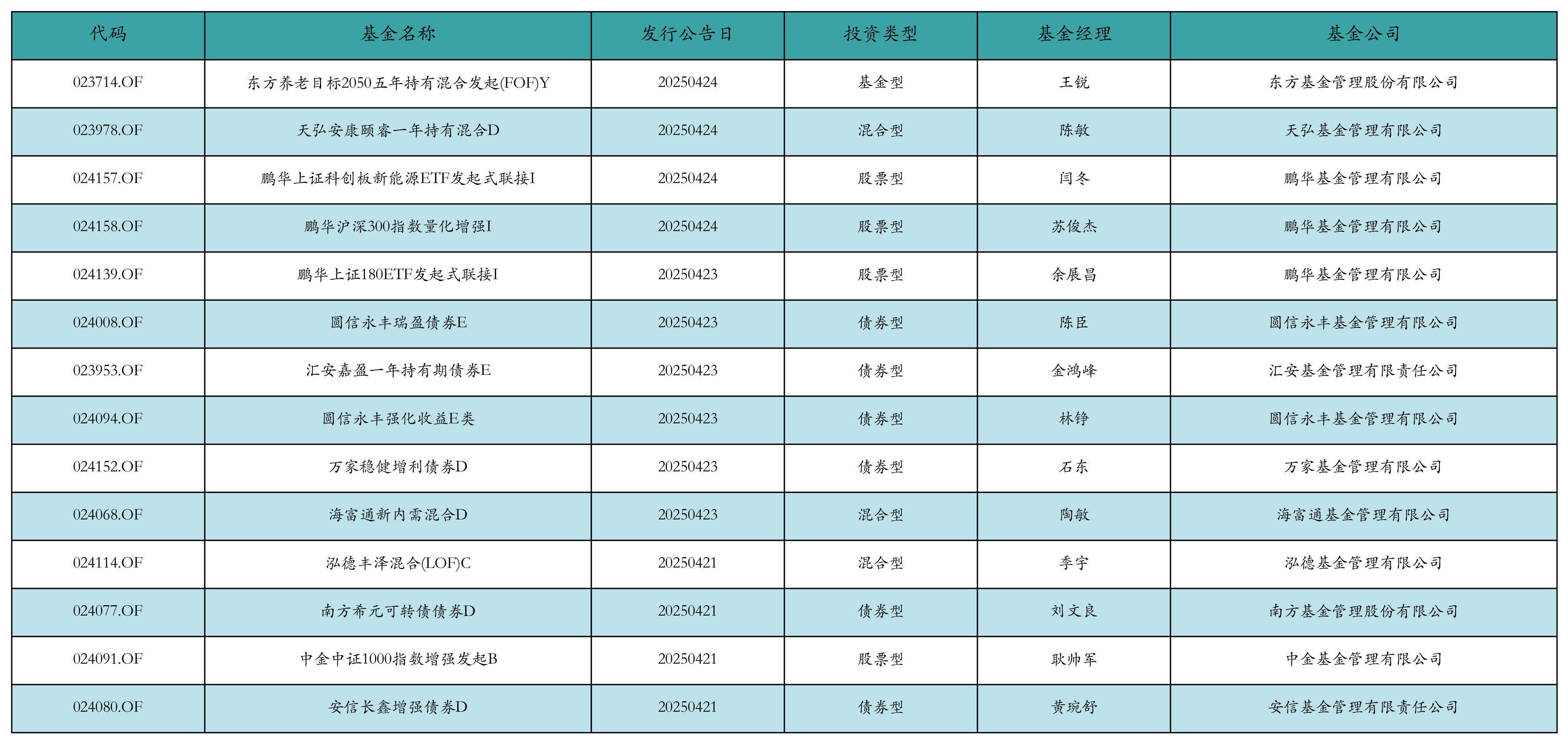 上周有14只新基金发行,分别为:东方养老目标2050五年持有混合发起(FOF)Y、天弘安康颐睿一年持有混合D、鹏华上证科创板新能源ETF发起式联接I、鹏华沪深300指数量化增强I、鹏华上证180ETF发起式联接I、圆信永丰瑞盈债券E、汇安嘉盈一年持有期债券E、圆信永丰强化收益E类、万家稳健增利债券D、海富通新内需混合D、泓德丰泽混合(LOF)C、南方希元可转债债券D、中金中证1000指数增强发起B、安信长鑫增强债券D,详情见下表:
