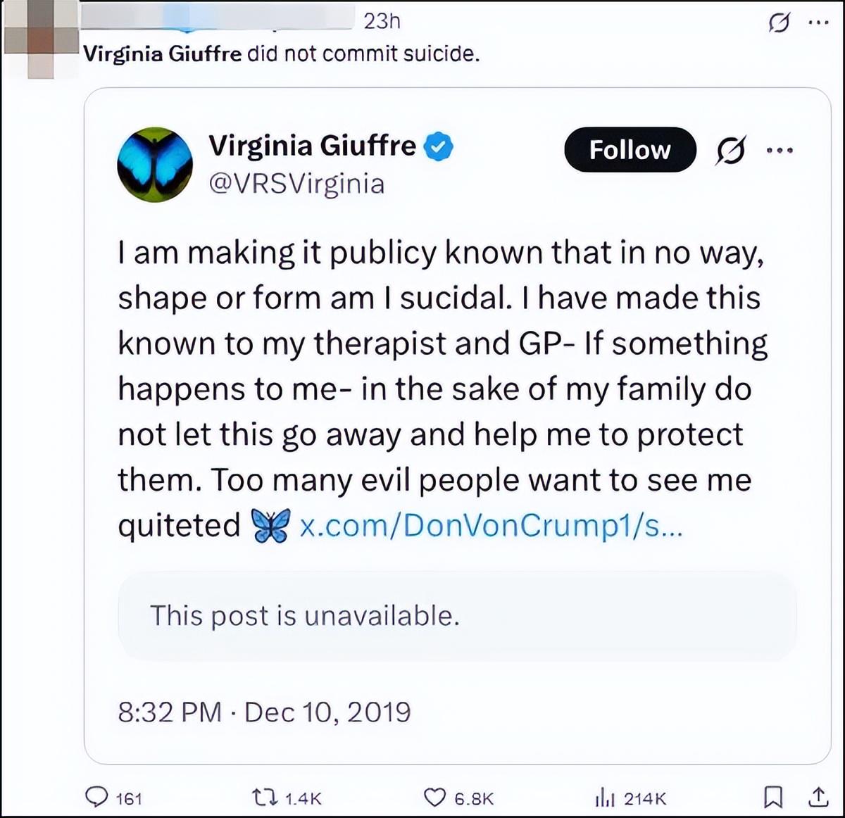 不少网民翻出弗吉尼亚曾在安德鲁王子诉讼案期间发过的一条“承诺绝不会以任何方式自杀”的推文,让此事再度蒙上疑云。