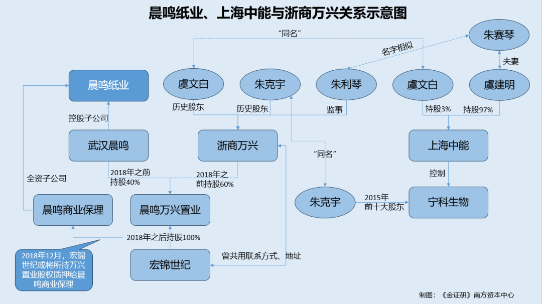 综合而言,回溯历史,2013年,晨鸣纸业子公司武汉晨鸣与浙商万兴合作开发房地产,约定武汉晨鸣不参与项目公司晨鸣万兴置业的具体经营管理,负责提供土地,浙商万兴负责给项目公司提供开发建设所需的所有资金。但合作期间,晨鸣纸业向晨鸣万兴置业曾拆出6亿元借款。而后,2018年,武汉晨鸣仅以1.32亿元将所持晨鸣万兴置业40%的股权予浙商万兴。而浙商万兴成为晨鸣万兴置业的全资股东次月,将前述股权转让予宏锦实业。3个月后,宏锦实业或将前述股权全部质押给晨鸣纸业子公司。上述情形背后,浙商万兴曾与宏锦实业共用联系方式,且浙商万兴股东虞文白与上海中能少数股东“同名”,或值得关注。