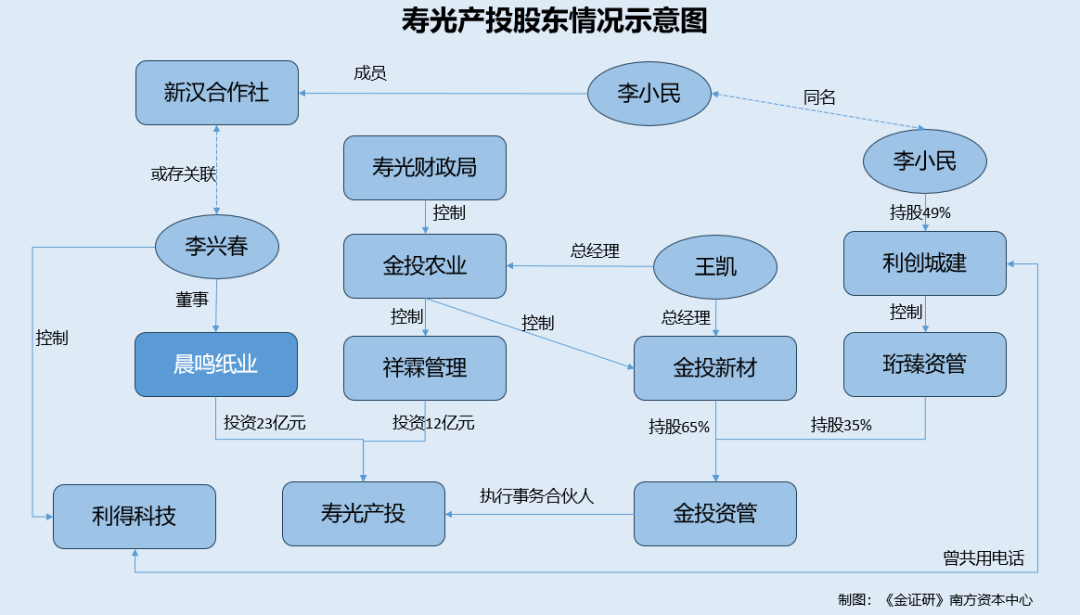 可以看出,寿光产投执行事务合伙人金投资管的少数股东珩臻资管,曾与晨鸣纸业董事李兴春控制的利得科技共用联系方式,且金投资管背后自然人股东李小民,与新汉合作社的成员李小民“同名”。
