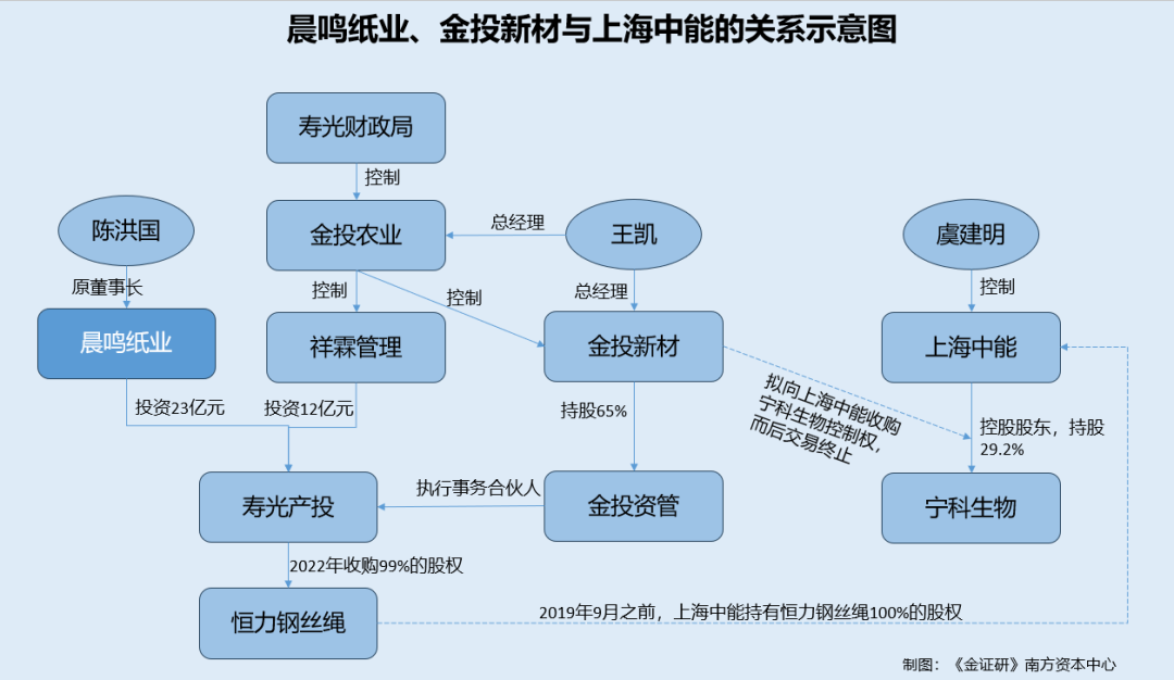 而围绕陈洪国、晨鸣纸业与虞建明控制的企业“故事”或值得关注。2015年,晨鸣纸业投资3亿元认购虞建明控制的上海中能企业发展(集团)有限公司(以下简称“上海中能”)的新增注册资本,而3个月后收回投资,该对外投资及收回投资事项由陈洪国在其权限范围内批准,并报董事会知晓。在此期间,上海中能以13亿元竞得上市公司宁科生物股权,成为第一大股东,同年宁科生物进行资产重组,在宁科生物资产重组的过程中,虞建明因涉嫌内交易被处罚超千万元。