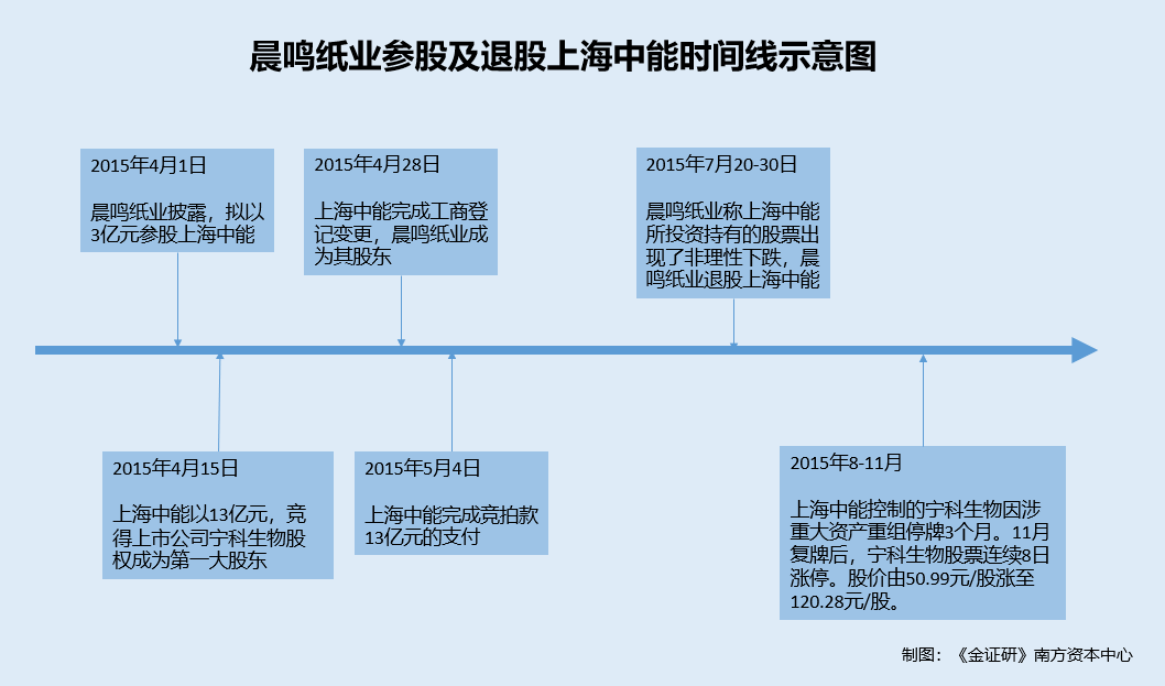 回顾过去,2015年4月1日,晨鸣纸业宣布以3亿元认购虞建明控制的上海中能新增注册资本。半个月后,上海中能通过司法拍卖以13亿元竞得上市公司宁科生物8,000万股的股份并在2025年5月完成对宁科生物股份竞拍款的支付、过户,成为宁科生物的第一大股东。随后同年7月,晨鸣纸业从上海中能处撤资,彼时上海中能将晨鸣纸业的3亿元投资款退还给晨鸣纸业。值得注意的是,上述晨鸣纸业参股、退股上海中能的决策,由时任董事长陈洪国在其权限范围内批准。而后,2015年8-11月,宁科生物进行重大资产重组,复牌后8天股价飙升。在这过程中,虞建明因存在向南粤银行行长泄露内幕消息而被处罚超千万元。