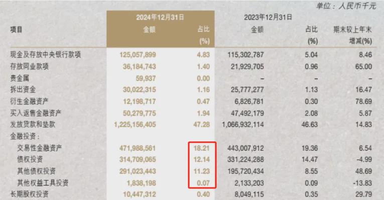 截至2024年底,南京银行涉及金融投资占总资产的41.65%,较上年底稍有下降,紧随占比46.1%的杭州银行、占比43.97%的宁波银行之后。