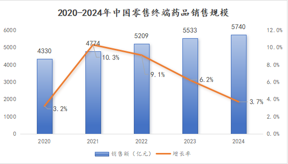 当前我国医药零售行业已告别盲目扩张期,进入存量市场淘汰整合阶段。米内网数据显示,2024年我国零售终端(实体药店+网上药店)药品销售规模5740亿元,同比增长3.7%,增速持续放缓。