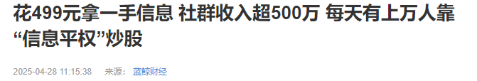 周末关于产业链割韭菜的事被热议,主要涉及“信息平权”和雪球几个大v,今天有媒体跟了一篇《花499元拿一手信息 社群收入超500万 每天有上万人靠“信息平权”炒股》,算是火上浇油,将事件进一步推向高潮。