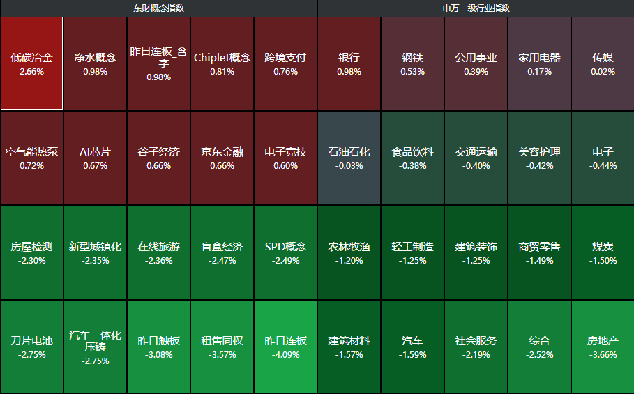 又到了长假前便秘期,再加上会议落地资金兑现,今天A股超过4100家下跌,77家跌停,主要是对冲关税的内需板块杀跌,房地产跌幅第一,服务消费跌幅第二,满满的亏钱效应。但上证指数盘中愣是横住了,不用问,又是银行板块在发力,建设银行、工商银行、江苏银行、成都银行创出历史新高,银行ETF也差不多创出去年924以来新高,人人都看不起银行,偏偏是银行最牛。