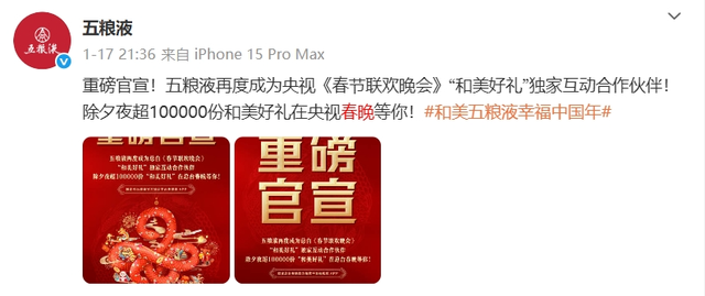 三是多管齐下深化品牌创新。一方面,五粮液借势顶流IP实现破圈传播,例如,2025年春节继续携手“央视总台2025年春节联欢晚会”这一全国顶级IP,通过“和美好礼”互动抽奖、品牌露出等,实现168亿次品牌触达等等。另一方面,五粮液创新社交营销,激活年轻圈层。例如,在小红书平台发起创意Vlog及表情包设计大赛,鼓励用户围绕五粮液品牌进行内容创作,在小红书平台上形成了强大的品牌传播声浪,推动品牌年轻化与时尚化。