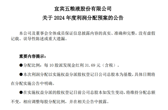 此外,五粮液持续以“真金白银”回馈投资者。2024年度利润分配预案显示,五粮液拟每10股派发现金红利31.69元(含税),合计分红123.01亿元;叠加2024年中期分红的100亿元,2024年,五粮液分红总额将达223亿元,分红率70%,分红总额较《2024-2026年度股东回报规划》中分红总额200亿元的兜底条款高出23亿元。