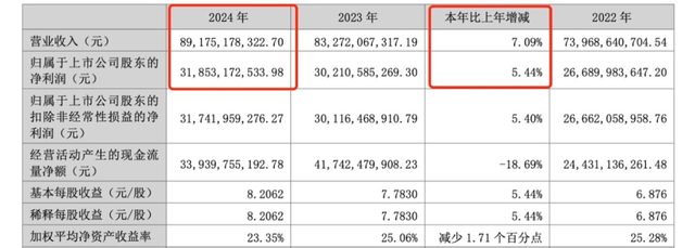 这一趋势,在五粮液的业绩上有着直接体现。年报数据显示,五粮液2024年度实现营业收入891.75亿元,同比增长7.09%;归母净利润318.53亿元,同比增长5.44%。值得注意的是,这已是五粮液连续第十年保持业绩稳健增长。
