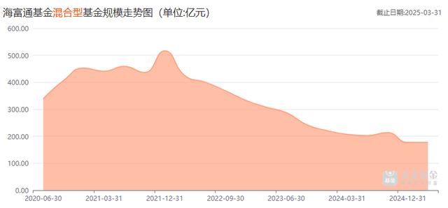 海富通改革驱动混合为规模最大的一只混合基金,近年来业绩表现不佳,尤其是近6个月净值下跌9.84%,远低于同类平均-0.7%。长期业绩下滑之下,产品规模也大幅缩水,截至2025年一季度末净资产为33.79亿元,相较2021年末峰值175.25亿元缩水80.72%。