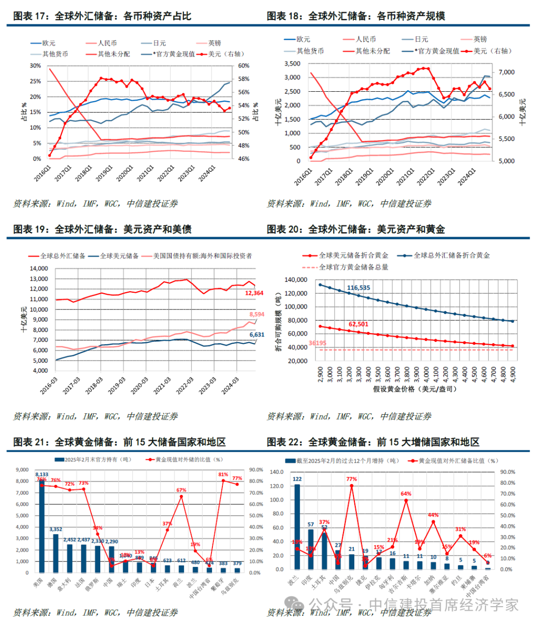 如图表15-图表22:1)4月2日贸易战开启之后,美元指数已跌破100荣枯线,黄金价格一度上探3500美元/盎司历史新高;2)按IMF统计,当前全球外汇储备总规模约12.4万亿美元,其中,美元储备约6.6万亿美元,占比约53.6%,按3300美元/盎司的伦敦黄金现价,每1个百分点的全球美元储备调仓,约可购黄金625吨,每1个百分点的全球总外汇储备调仓,约可购黄金1165吨;3)按世界黄金协会统计,截至2025年2月,全球官方黄金储备持有共计约36195吨,按2月末的伦敦黄金现价2835美元/盎司估算——黄金已成为与欧元权重并列的第二大全球储备资产,各占全球总储备的约20%左右份额,与约占53.6%的美元储备一起,共同构成了当前全球外汇储备的三大主要资产。
