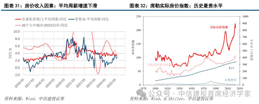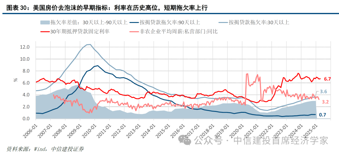 随着特朗普贸易战的开启,美国房地产市场的价格去泡沫压力在于:1)一是美国实际房价指数,仍在历史最高水平;2)二是房价的居民收入支撑因素承压,贸易战如不能快速实现和解,本就正在下滑的非农周薪增速,将可能进一步减速甚至转负;3)三是除收入外的另一重要支撑,美国的房贷利率正在高位,目前与其次贷危机前的峰值水平相当。如图表30-31,从2024年下半年以来,美国30天以上和30-90天的居民按揭贷款拖欠率,出现了次贷危机以来的新一轮较快边际上行,反映了房贷居民短期流动性条件的转弱——如这一指标在未来30-90天继续,意味着当年次贷危机早期信号的重现,短期拖欠将逐步转为长期拖欠,最终形成实际违约。