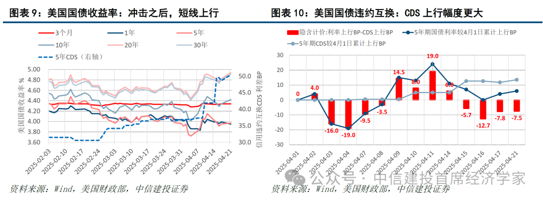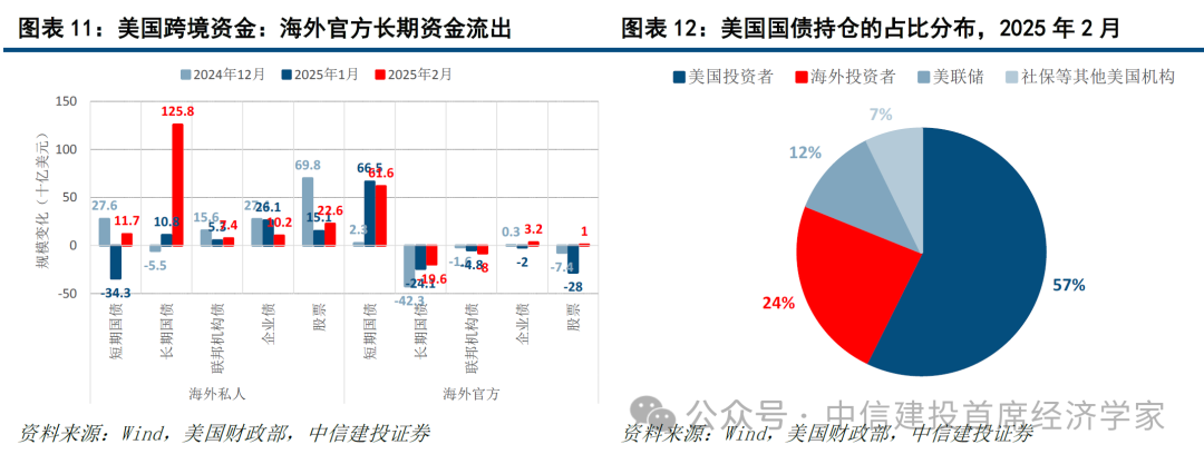 从4月2日特朗普开启本次贸易战以后,美国国债市场出现了较显著的信心危机,主要期限国债利率不降反升,以国债违约互换CDS计价的违约风险上行快于利率上行,反映了国债市场既在开始计价经济衰退,又在开始计价主权信用违约。如图表9-图表12:1)截至4月21日收盘,较贸易战开始的4月2日,5年期美国国债违约互换CDS上行约13BP,5年期美国国债收益率上行约6BP,去掉违约风险补偿增加部分,隐含的国债利率下行约7BP;2)截至最新公布的2025年2月数据,海外官方资金继续对美国长期资产保持减持状态,海外官方和私人投资者合计持有约8.6万亿美元美国国债,占市场总规模的约24%。