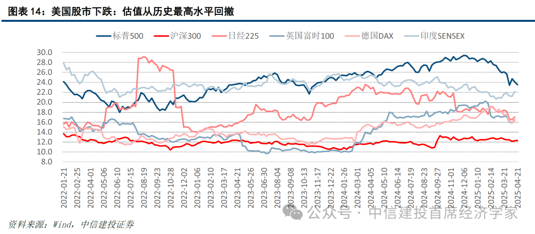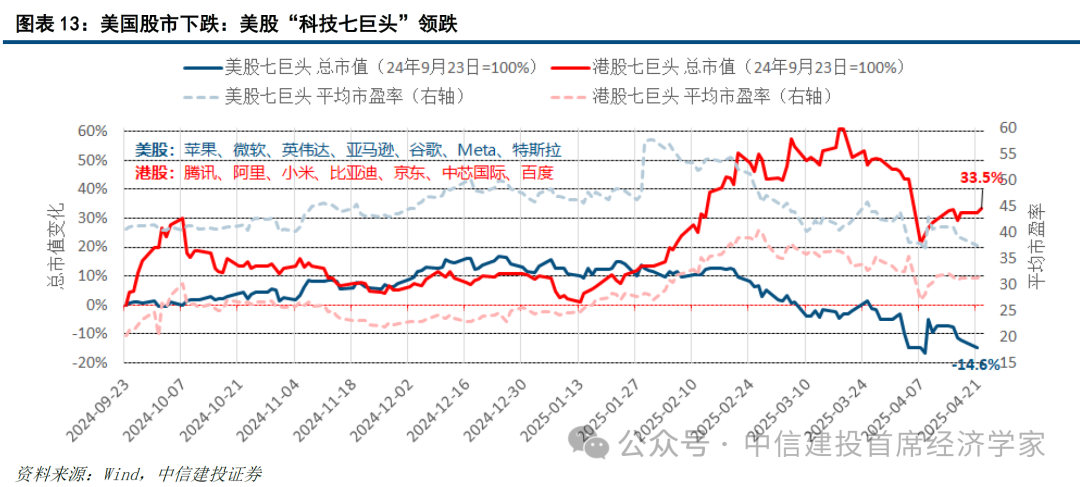 从4月2日特朗普开启本次贸易战以后,美国股票市场出现了较显著的信心危机,由于担心贸易战冲击企业营收,尤其是上市企业中的跨国企业、科技企业和消费企业,标普500等核心指数从历史最高估值开始回撤,美股科技七巨头向下领跌。如图表13-图表14,截至4月21日收盘,美股标普500指数的滚动市盈率约为23.5倍,从前期历史性高点的约29倍开始回撤,但仍属于历史较贵、全球最贵的估值水平,美股较德国、日本、英国、我国等全球其他主要股市的市盈率仍偏贵约10倍左右——如贸易战继续而不撤除,这部分估值溢价将持续受到信心减弱、资金流出、经济前景黯淡等因素的多重冲击。