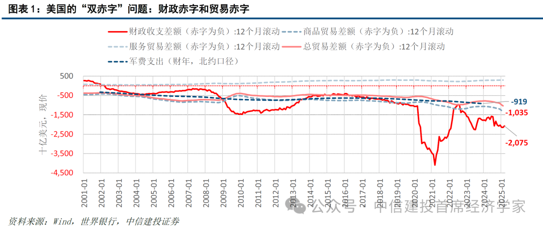 美国近三十年来出现持续的“双赤字”,贸易赤字只是表象,财政赤字才是核心根源——但财政赤字的调整往往需要深刻的自省改革、艰巨的选民教育,在少数民粹主义短视政客的眼中,远没有以对外贸易为借口、掩盖内部矛盾来的“看似容易”。如图表1,截至2025年3月,美国的12个月滚动财政赤字已超过2万亿美元,远超国际贸易赤字的10350亿美元规模; 2024财年,仅军费开支就接近1万亿美元,特朗普已表示2025财年的军费开支预算将超过1万亿美元。