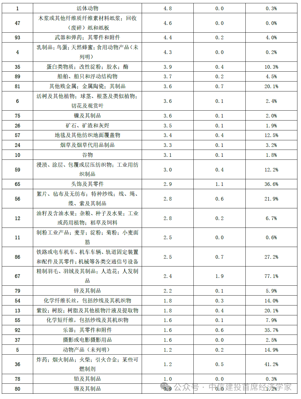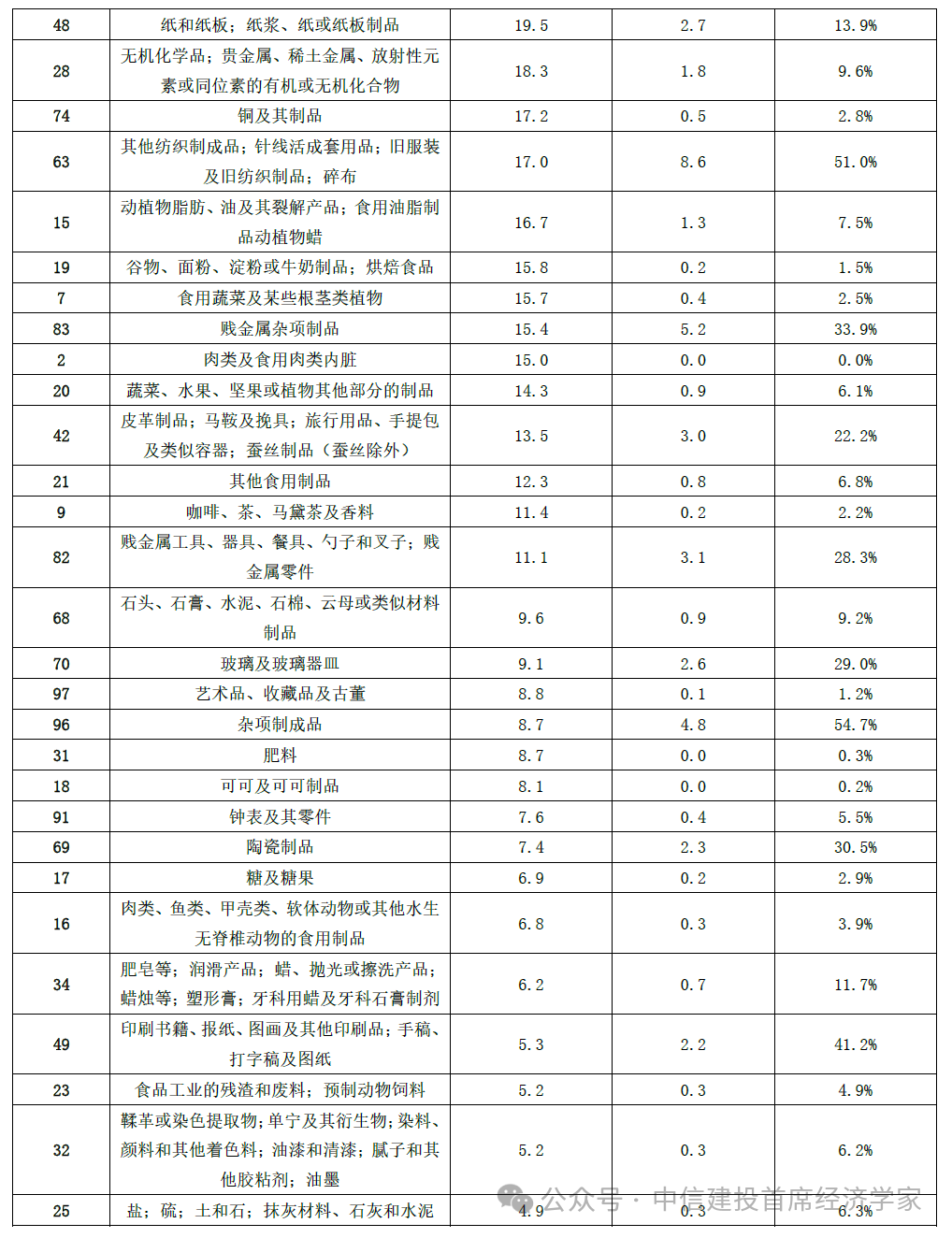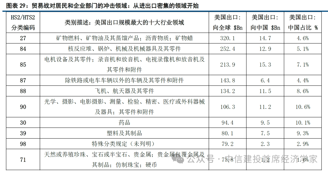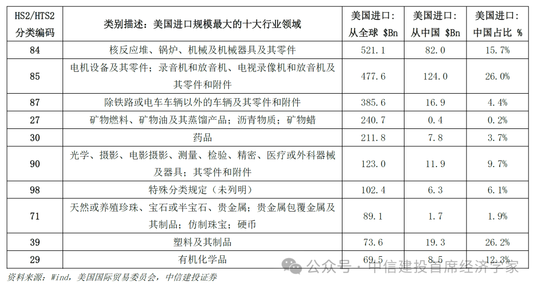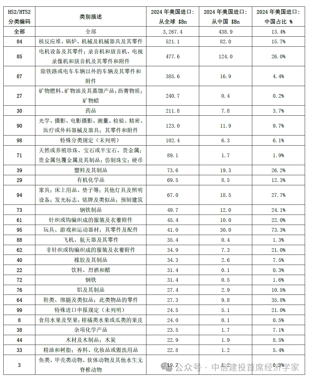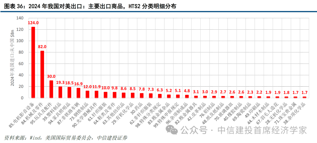 如图表26-图表27,按世界海关组织的国际贸易商品名称协调编码制度(Harmonized Commodity Description and Coding System, 缩写HS;美国海关使用其美国衍生版本,Harmonized Tariff Schedule,缩写HTS)的二级商品分类(有99个二级分类,即HS2/HTS2目录下的大类商品1-99)——2024年美国进出口商品规模较大、或集中度较高的主要行业,主要有:机械及零件(84)、电机影音设备(85)、非铁路车辆(87)、矿物燃料制品(27)、药品(30)、光学器械具件(90)、玩具及配件(95)、鞋类及零件(64)、飞机航天器(88)、油籽植物饲料(12)、铜制品(74)等——完整的2024年美国总出口和总进口的HTS2分类明细,与其中的中国份额占比,可参见文末的附录B和附录C。