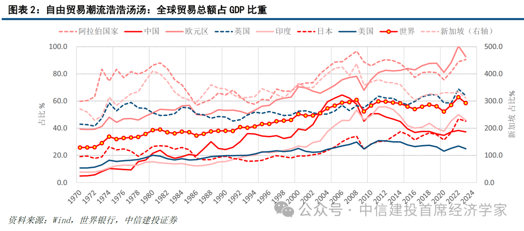 随技术进步带来全球更紧密互联互通,当前全球贸易总额占全球GDP的比重,已从英国工业革命前的不到1%攀升至2023年的约60%,多数国家深度融入全球经济分工合作,任何国家的逆全球化和贸易战企图,都是不合经济道理、不得世界人心、没有出路的。如图表2,全球众多经济体年贸易总额占GDP比重在40%以上,新加坡等外贸型国家的贸易总额占GDP比重超过300%,多数经济体不会认同极限施压的贸易战举措。