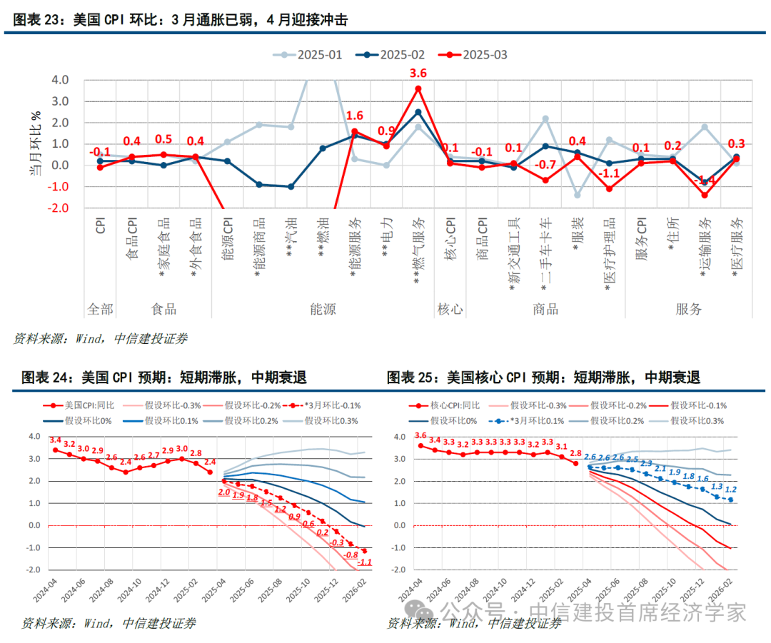 从4月2日特朗普开启本次贸易战以后,美国通胀正在面临短期和中期反向的双向冲击扰动,一是短期的滞胀上行冲击,主要是由于贸易阻断、居民抢购和库存消耗,二是中期的衰退下行冲击,主要是就业损失、利润损失、财富损失和经济衰退压力。从“短期滞胀”、到“中期衰退”、到“重建稳定”的转向时点,取决于“供给阻断”、“消费损失”和“恢复正常”的传导节奏,高度受特朗普贸易战的多变政策的影响。