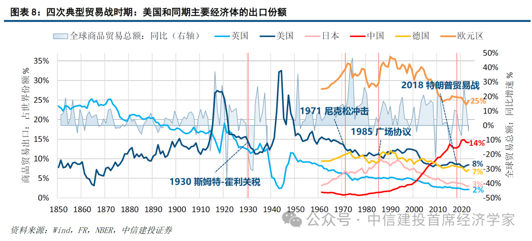 美国本轮股债汇超预期下跌的内在原因是,贸易战不仅不能解决美国现有问题,还将为美国带来更多的问题,美国虽仍是全球最强的单一经济体,但在贸易战面前亦有九大软肋,如不尽快、全面撤回贸易战措施,其将在国债、股市、美元、通胀、产业链、居民企业、房地产、经济结构、软实力等领域,面临越来越多的冲击。如图表8,在1930年、1971年和1985年发动贸易战时,美国是全球最大的产业出口国家,而随着欧元区的建立、我国的发展、全球化的深化,此次贸易战的背景是美国既不具备压倒性的产业优势,又要面对逆全球化潮流的不得人心,以及进而全球投资者的用脚投票。