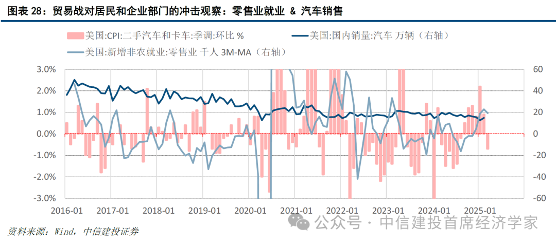 如图表28-图表29,从历史经验上,对于需求型经济体,零售业是对贸易战相对最敏感的行业——其中,零售业就业和汽车零售的相关数据,常被用作观察贸易战对居民消费和信心冲击的关键判断指标,目前,汽车销售数据在美国已出现走弱迹象。