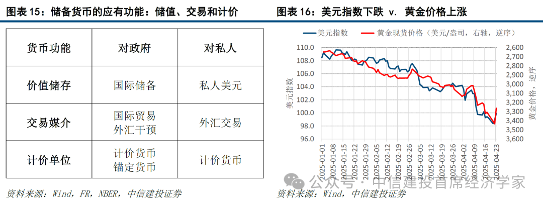 从4月2日特朗普开启本次贸易战以后,美元指数加速走弱,贸易战的一系列当前和后续潜在措施,动摇了美元作为全球储备货币的三大功能,即价值储存、交易媒介和计价单位,同时,特朗普在贸易战内外压力下,持续就美联储货币政策和人事任免表态,进一步削弱了全球对美元维持储备货币自律的信心。如特朗普继续坚持贸易战和削弱美元储备货币功能,则后续美国的美元贬值预期、政府债务压力、流动性宽松预期、经济衰退预期、全球公共服务和美元金融体系武器化等问题将进一步凸显——则全球央行、外汇储备、主权基金等大型财富管理机构将进一步调降美元资产的配置比例,欧元、黄金、人民币等非美元资产将进一步接受由美国市场流出的全球资金再平衡收益。