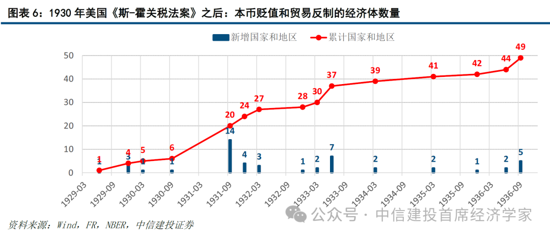 在本报告文末,附录A进一步给出了美国《斯姆特-霍利关税法案》发布后,其他主要经济体的贸易反制跟进时间线。法案的始作俑者参议员斯姆特、众议员霍利、签署总统胡佛,皆在后续的1933年大选中下台,而新总统罗斯福则从1934年开始,开启了包括降低关税、促进自由贸易等措施在内的罗斯福新政。