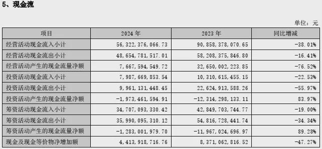 逆周期较高强度的拿地投资,在滨江集团2024年现金流影响还是很大的,比如期内经营净现金流76.67亿元,同比明显下滑76.5%;投资净现金流-19.7亿元,净流出同比大幅收窄;融资净现金流-12.83亿元,净流出同比大幅收窄,说明集中在还债。