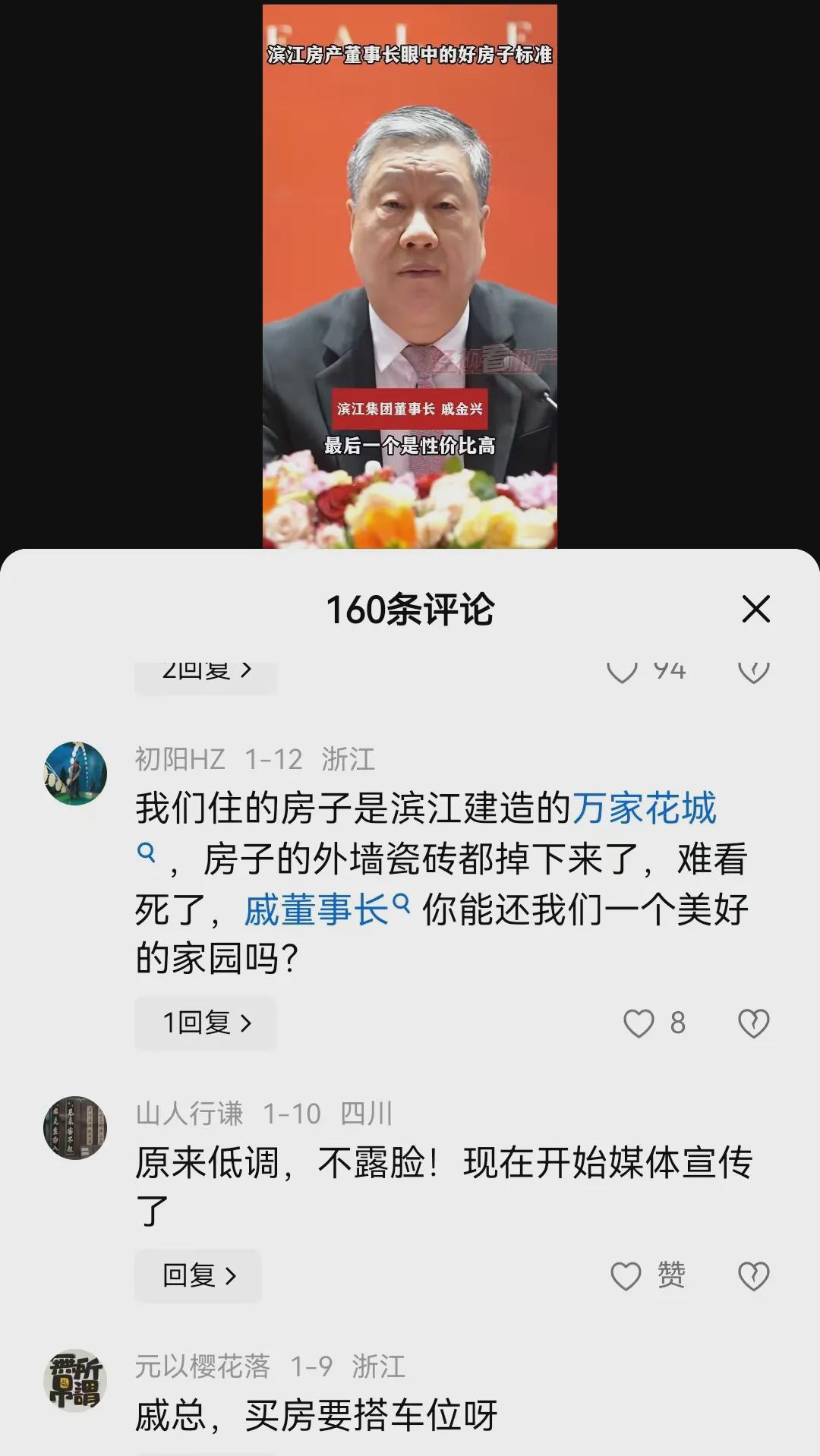去年底,在滨江集团2024年媒体会上,董事长戚金兴曾直言,很多房企受了重伤,滨江受的只是轻伤。他还罕见谈到了“好房子”标准,而滨江集团的口号就是“让老百姓都能住上一套好房子”。
