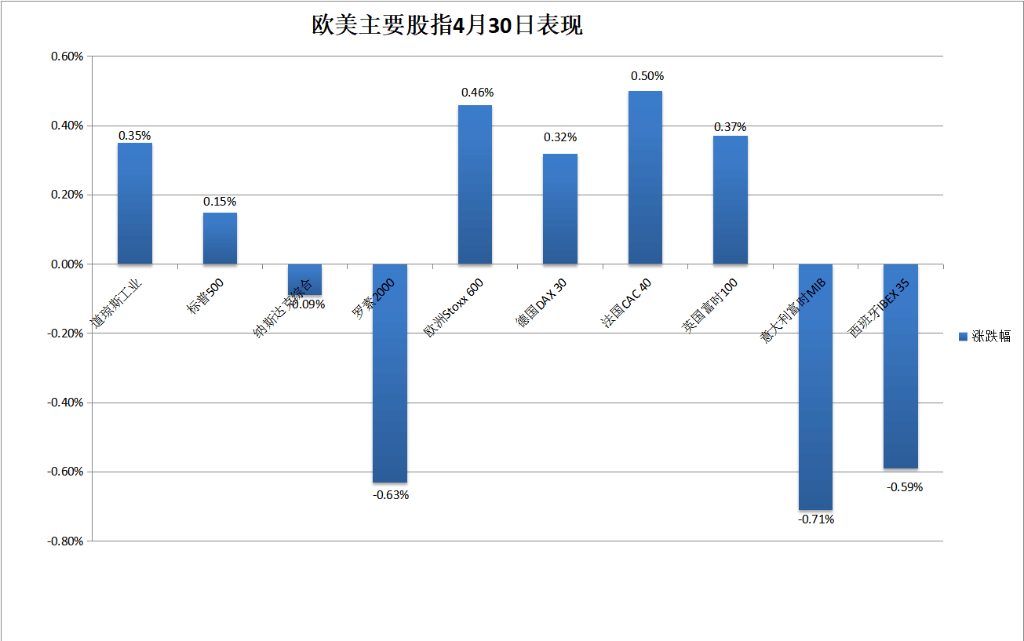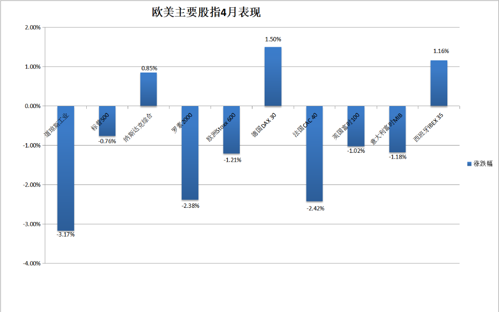 欧元区一季度GDP意外回暖,德、法经济勉强实现增长,但美国疲弱经济数据拖累,泛欧股指盘中曾转跌,最终连续七日收涨,但未能抹平全月跌幅,连跌两月。