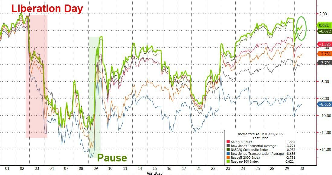 美国三大股指:早盘曾跌超780点的道指收涨141.74点,早盘曾跌2.3%的标普500指数小幅收涨,均继续刷新4月2日以来高位,早盘曾跌2.9%的纳指收跌不足0.1%。4月标普累跌0.76%,道指累跌3.17%,罗素2000累跌2.38%,均连跌三个月,纳指和纳斯达克100在连跌两月后反弹,分别累涨0.85%和1.52%。4月初,在特朗普公布对等关税的所谓“解放日”后,美股大跌,后特朗普暂缓部分关税,美股迎来一波反弹,随着美国同他国进行贸易谈判和磋商的消息传出,美股逐步抹平多数跌幅。