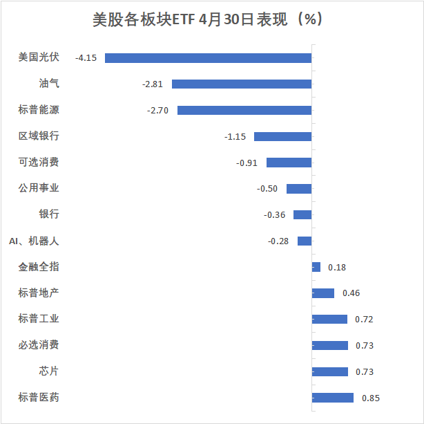 美股ETF:生物科技ETF涨约1.5%,领跑美股行业ETF,能源业ETF跌2.7%,表现最差;1月-4月航空业ETF跌约22%、半导体ETF跌越13%、可选消费ETF跌约12%。