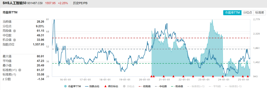 中证沪港深人工智能50指数目前的市盈率TTM还在历史10%分位以下,属于很低的水平。