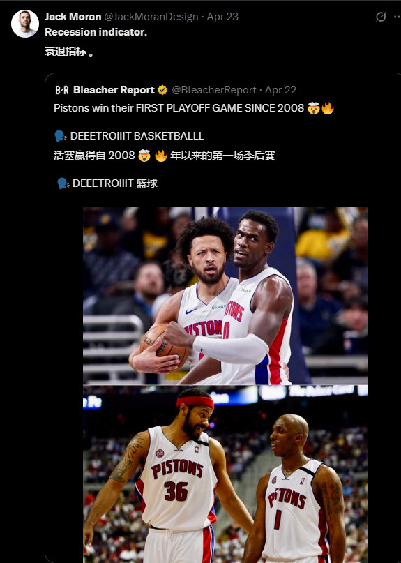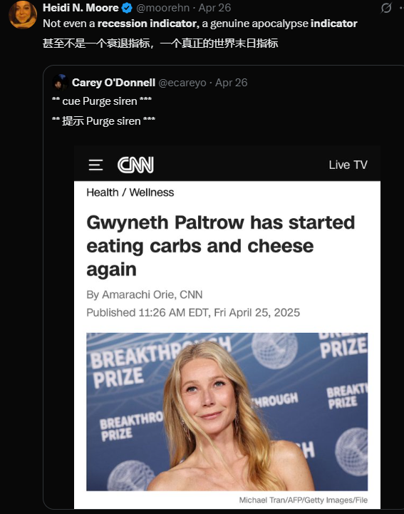 有趣的美国网友表示,好莱坞最严格的素食主义者格温妮丝·帕特罗又开始吃螃蟹和奶酪,或者NBA底特律活塞队赢下2008年以来首场季后赛,冰桶挑战死灰复燃,老美剧《嗜血法医》重启,吸血鬼文化再次泛滥,都是经济衰退的迹象!