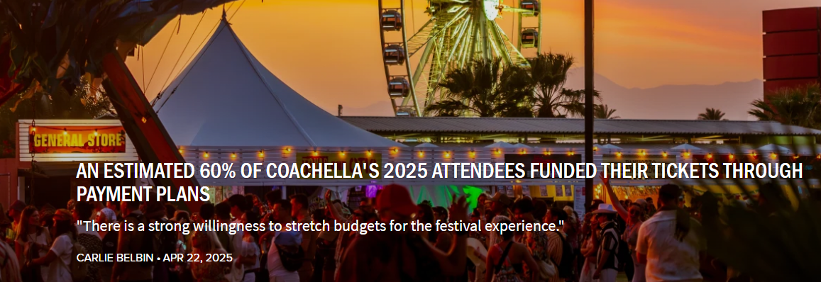 再比如,今年已经有高达60%的乐迷,用分期付款购买599美元的音乐节门票……这些乐迷总计要多付41美元服务费,才能将首付降至49.99美元,再分10个月还清欠账。