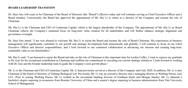 4 月 29 日晚,瑞幸咖啡公布第一季度财报时宣布重要人事变动:郭谨一卸任董事长,继续担任 CEO 及董事,大钲资本董事长黎辉接任董事长。这一变动引发市场高度关注。