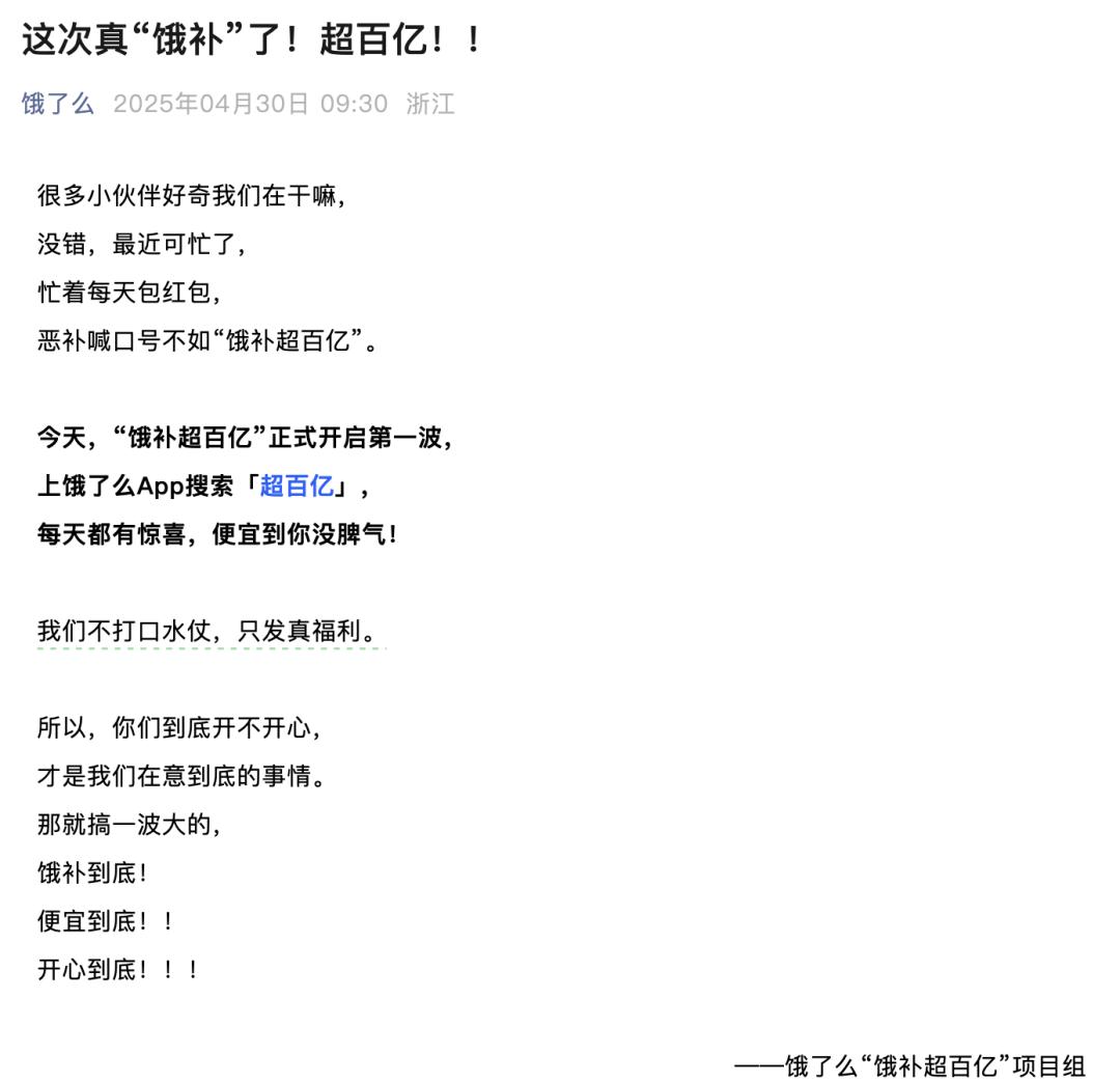 4月30日,饿了么官方公众号发文宣布,将进一步加大平台补贴力度,即日起开启平台“饿补超百亿”大促,APP内也已上线“超百亿”口令词入口。