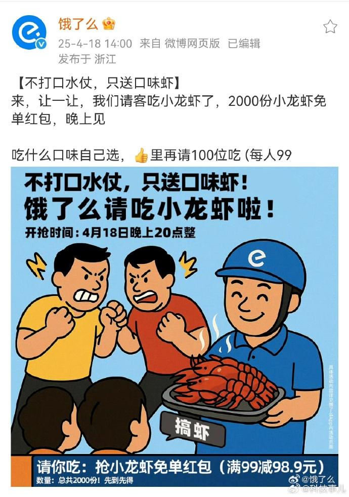 有一些习惯在饿了么上下单的用户早已发现,不足10元的午餐、几毛钱的奶茶,近期都比平时常见了许多。4月18日, 饿了么 的官方 微博 也 发 出 一条 意有所指 的动态:“不打口水战,只送口味虾,2000份小龙虾免单红包。” 在宣传活动的同时,表达了对待这一轮外卖大战的态度。