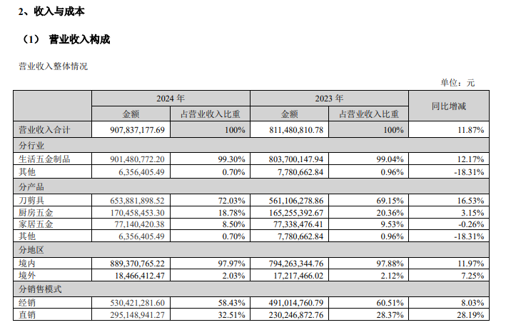 先从张小泉2024年的各项财报数据来看。分产品端,张小泉2024年刀剪具类目实现收入6.54 亿元,占主营收72.03%,同比增长16.53%;厨房五金类目实现收入1.7亿元,占总营收18.78%,同比增长3.15%;家居五金类目实现收入7714.04万元,占总营收8.5%,同比下降0.26%。