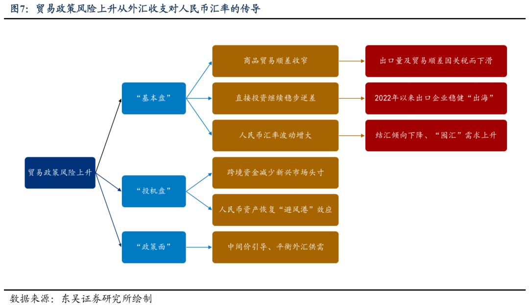 从外汇收支角度看,美元兑人民币汇率波动是美元和人民币相对供需的结果,市场往往沿袭2017年至2019年的经验,将加征关税的幅度与人民币汇率贬值的幅度划等号,或从货物贸易顺差受关税影响的规模倒推人民币汇率承压的水平,但是相比2017年至2019年,2022年以来人民币汇率市场的机构行为已经发生了较大变化,企业“囤汇”、央行/外资银行在掉期市场的操作,2022年以来持续构成汇率波动的主线。