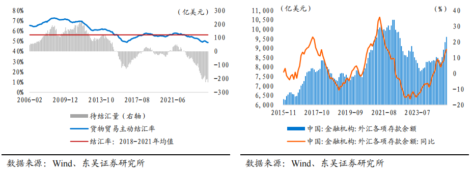 我们曾经在专题报告《人民币有序贬值或为货币宽松打开窗口》中阐述,企业和居民“囤汇”尽管表明市场仍预期人民币会贬值,但是实际上也会在人民币“充分”贬值时成为“抄底”买入人民币、稳定外汇市场供需的力量。在2025年已知的关税政策风险尚未完全落地的情形下,待结汇盘规模或延续扩张,形成“抢出口推升结汇量+贬值担忧推升待结汇盘”的资金组合,如果外部环境向着持续利多非美货币的图景演化,美元指数确认持续处于“弱美元”状态,待结汇资金或逐步释放。