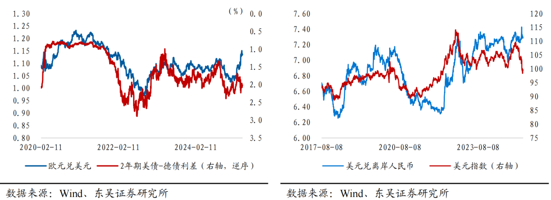 从贸易政策风险向人民币汇率的传导机制来看,2025年4月份以来,外汇收支呈现“基本盘”稳固和“投机盘”迎来跨境资金回补的利多,将美元兑人民币汇率稳定在7.30左右的水平,但是关税政策风险并未解除,4月份以来美元指数和人民币汇率一度呈现“双弱”局面,美元指数走弱已偏离传统的利差逻辑,从欧元兑美元汇率来看,4月份以来2年期美债与德债的收益率之差扩张至2.0个百分点,而欧元汇率则大幅走高,背离了可自由兑换货币的利率平价条件,显示4月份以来美元指数下跌并非出自基本面主导,而是资金主动“去美元化”引致的抛压,警惕美元指数和利差逻辑的重新修复风险,当利差重新主导汇率波动,美元指数或开启反弹,届时包括人民币汇率在内的非美货币或承受贬值压力。