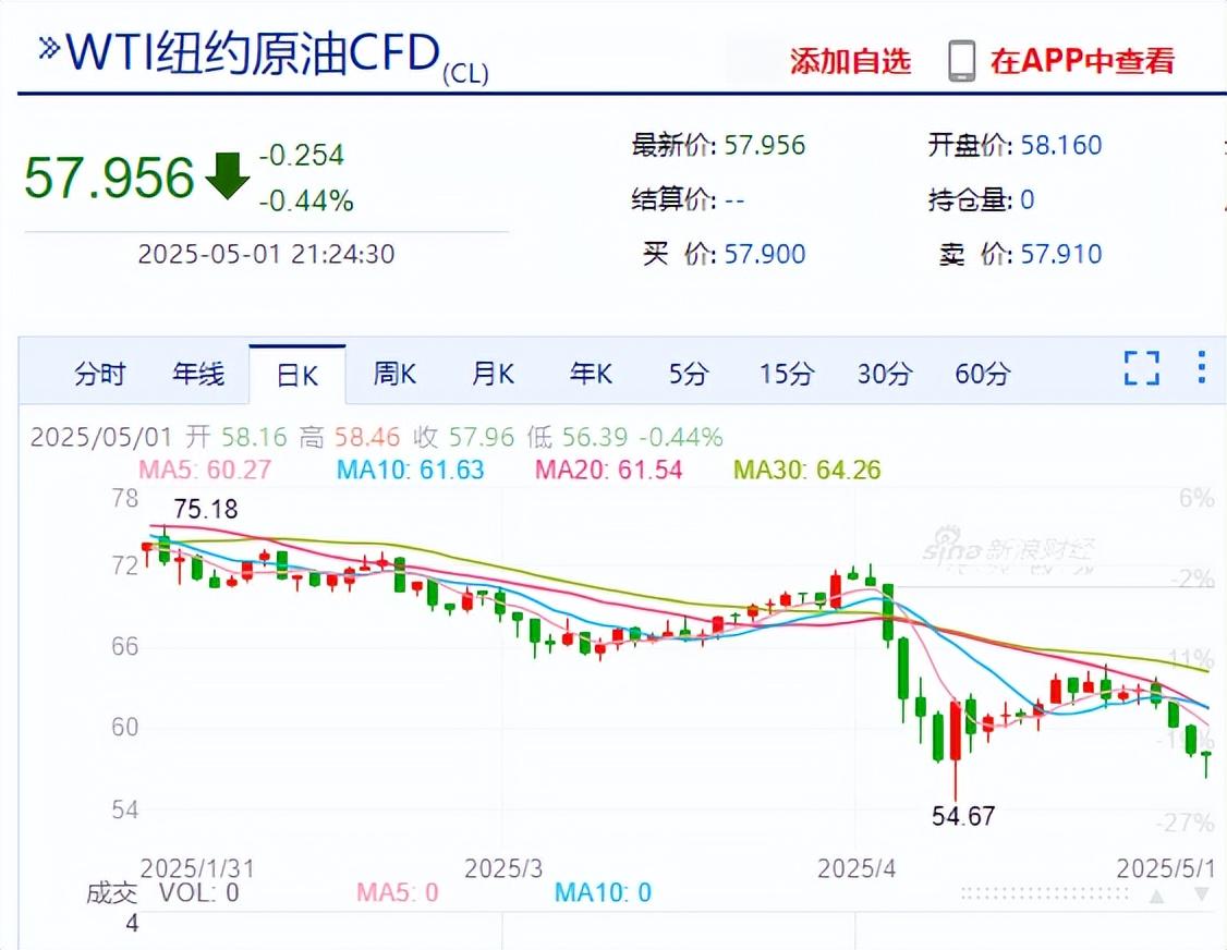 下图是纽约油价的日K线,进入2025年以来一直阴跌不止。从75.18美元/桶跌到了目前的不到58美元/桶,跌幅接近23%,堪称今年以来最熊的大宗商品。