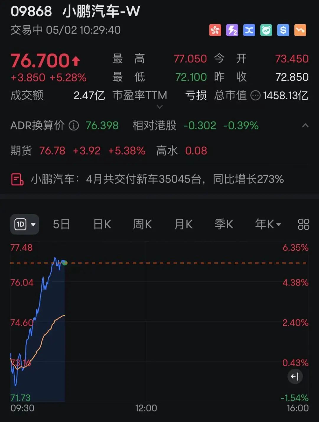 小鹏汽车港股涨超5%, 5月1日,小鹏汽车公布最新交付成绩。2025年4月,小鹏汽车共交付新车35045辆,同比增长273%,环比增长6%。小鹏MONA M03上市8个月累计交付超10万 辆 ;小鹏P7+上市5个月,近日已完成第5万台新车下线。2025年1月—4月,小鹏汽车累计交付新车共129053 辆 ,同比增长313%。