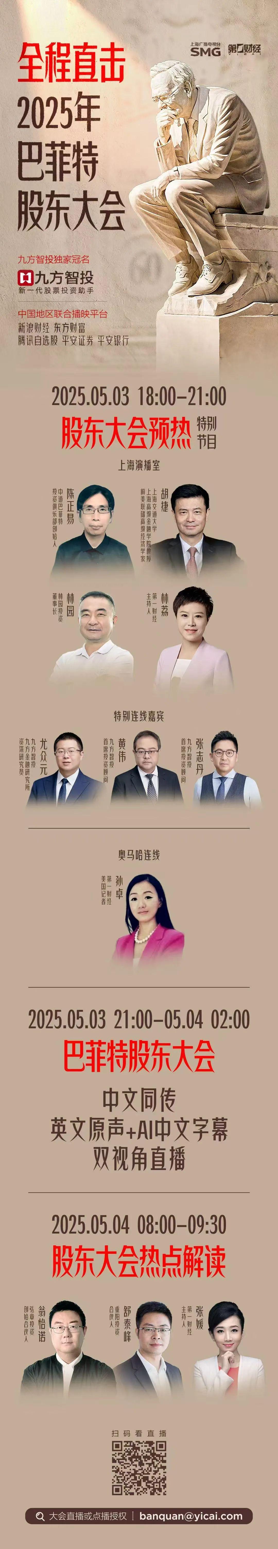 本次2025巴菲特股东大会直播活动由九方智投独家冠名。让我们一起期待今年的巴菲特时间!观众也可锁定九方智投控股视频号,全程观看直播。