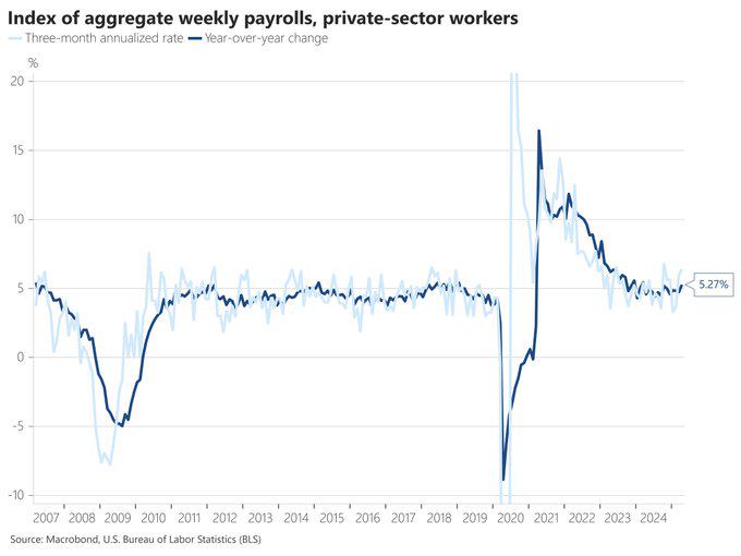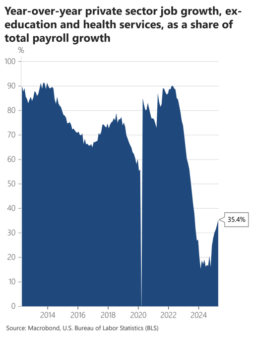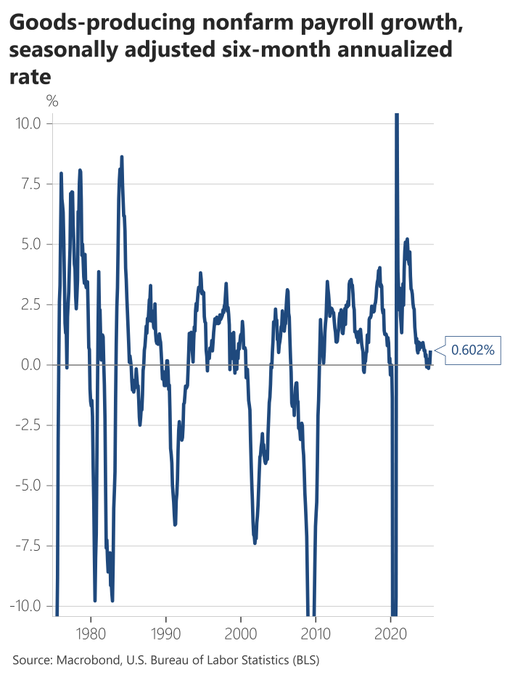 Timiraos指出,一些特朗普的顾问曾表示,之前的就业增长被“美化”了,因为它主要来自政府部门或与经济周期无关的医疗和教育领域的招聘。但这种情况在3月和4月并未出现。剔除政府、教育和健康服务的招聘后,这两个月的就业增长仍分别达到9.6万和9.7万。